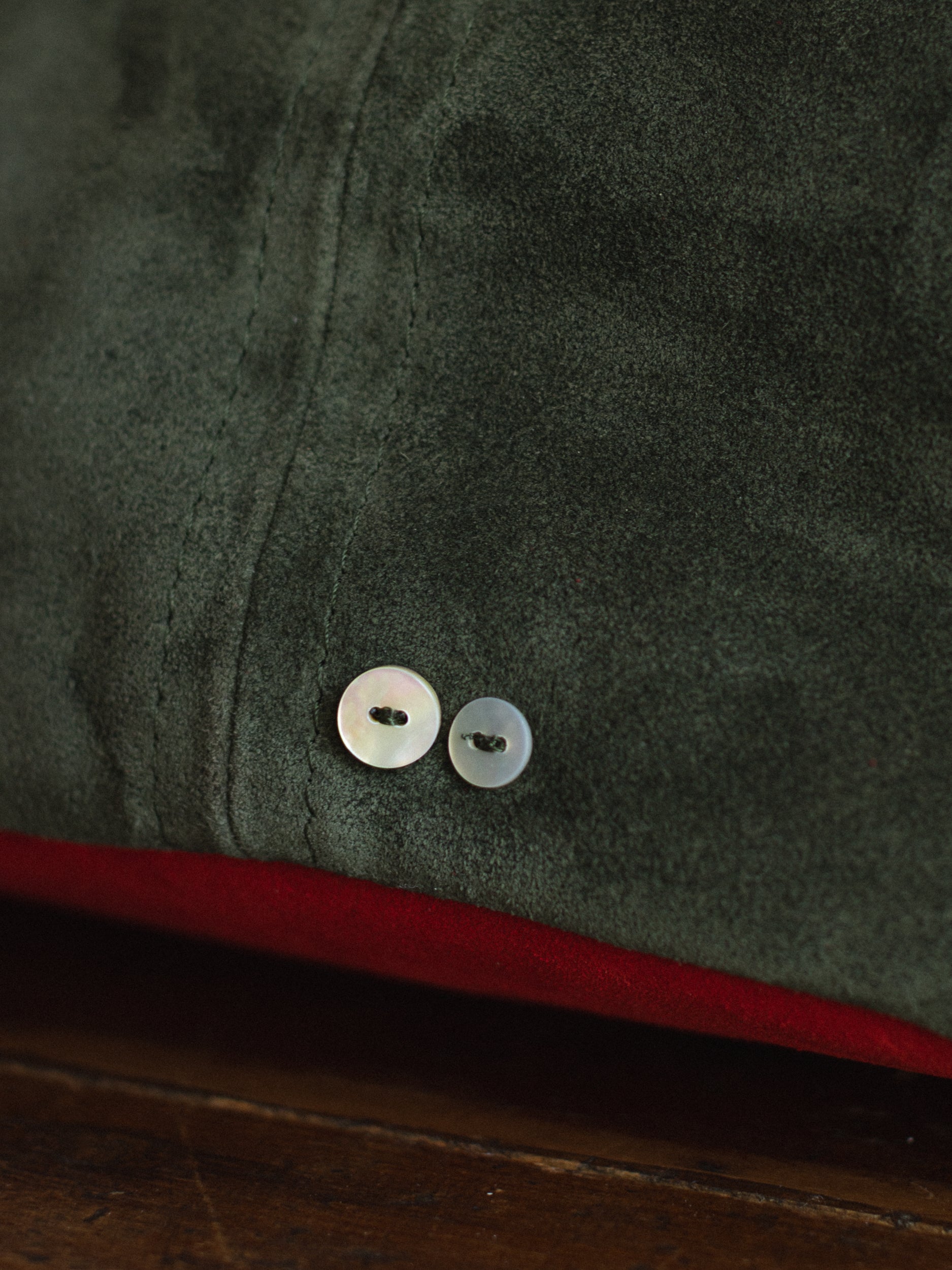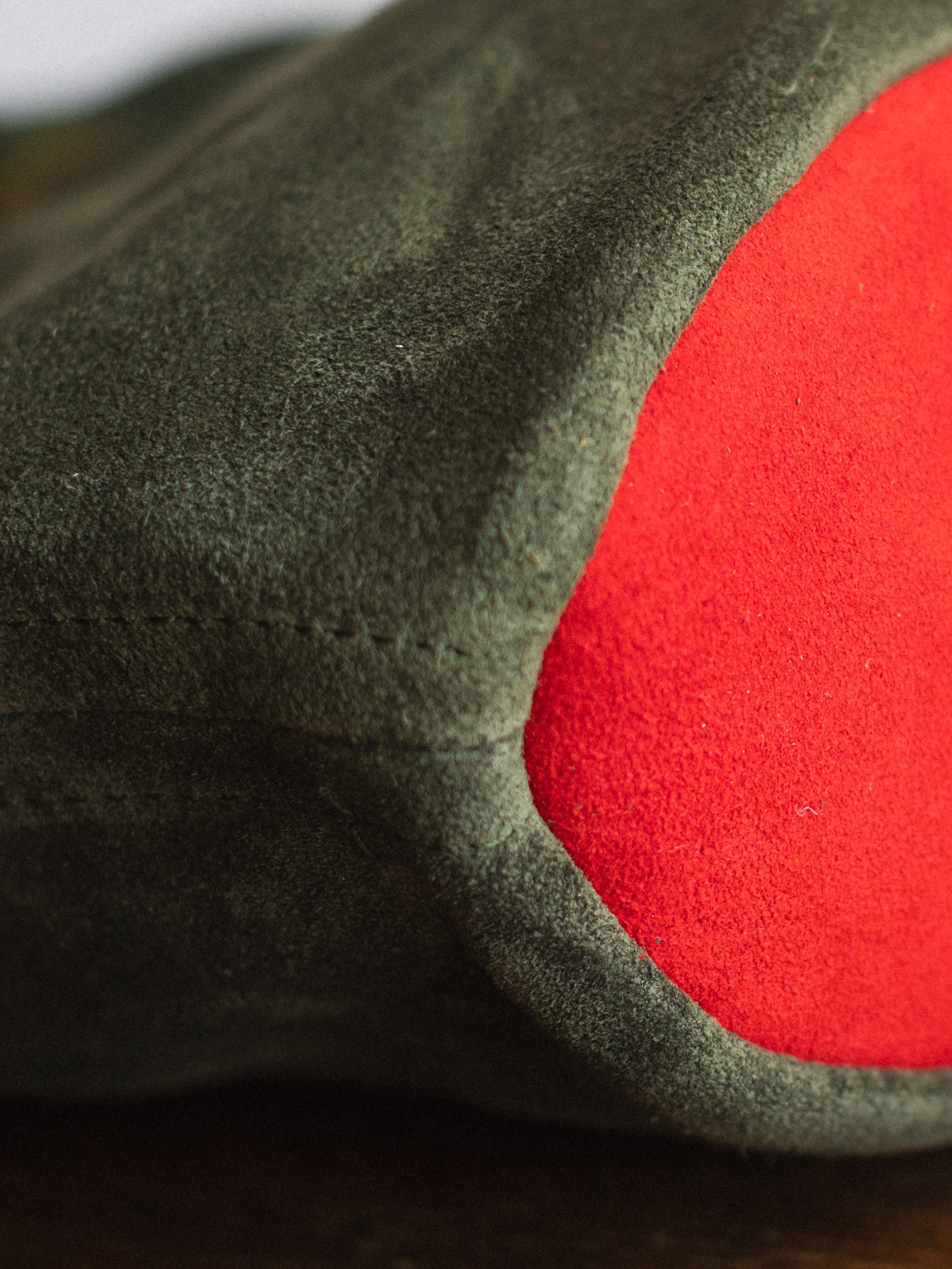 The Olive Bag was made in a dream — a verdant suede handbag with a pimento red bottom. Cleo was inspired by an olive-shaped velvet pillow she knew and loved as a child.