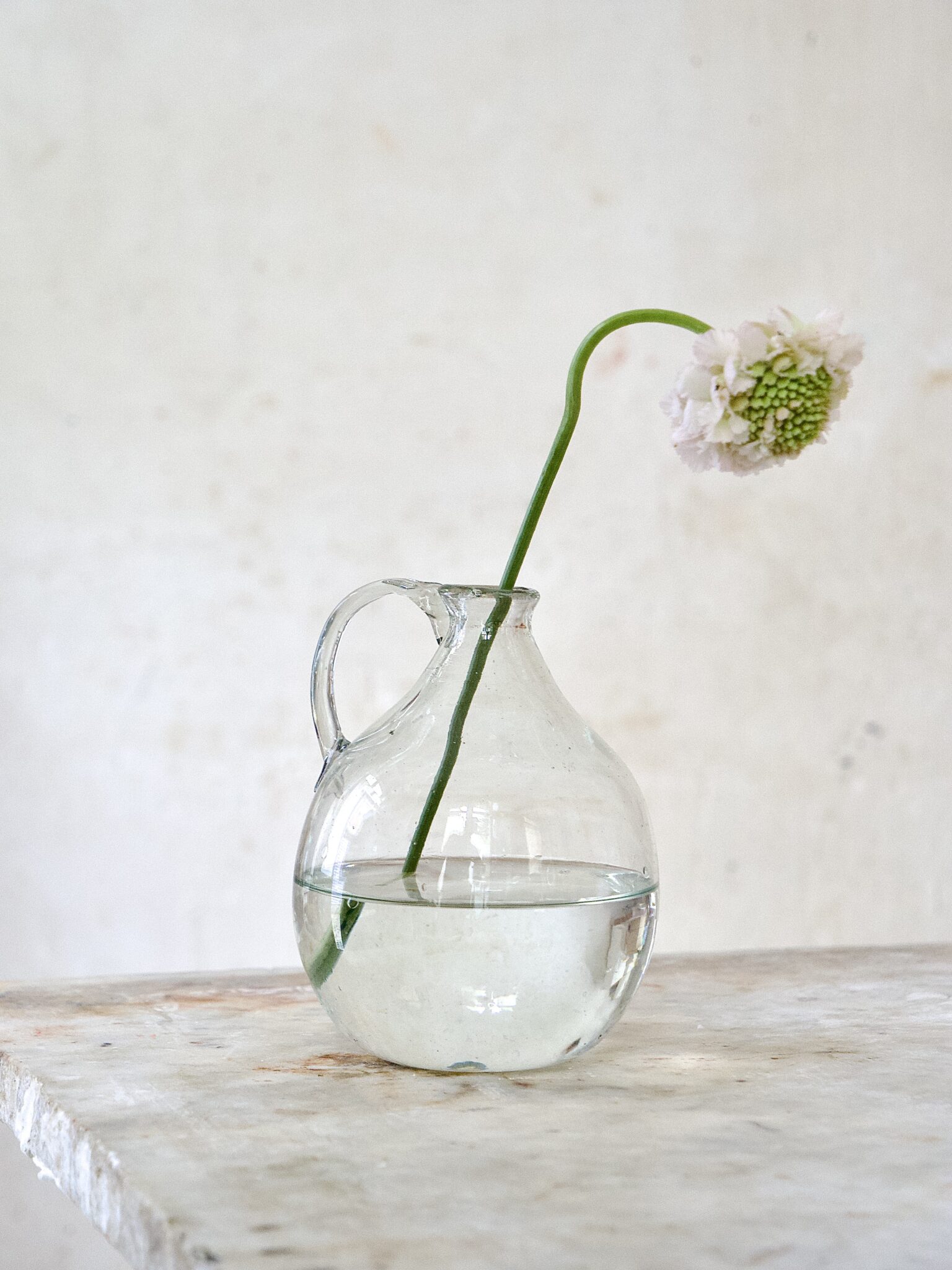 The Jug Roi has a story as charming as its silhouette. Inspired by an antique jug gifted to Valentina by a close friend, its round body, short neck, and curved handle echo the elegance of a bygone era. Each Jug Roi is mouth-blown from transparent recycled glass by our master artisans — a thoughtful blend of old-world inspiration and sustainable craftsmanship.