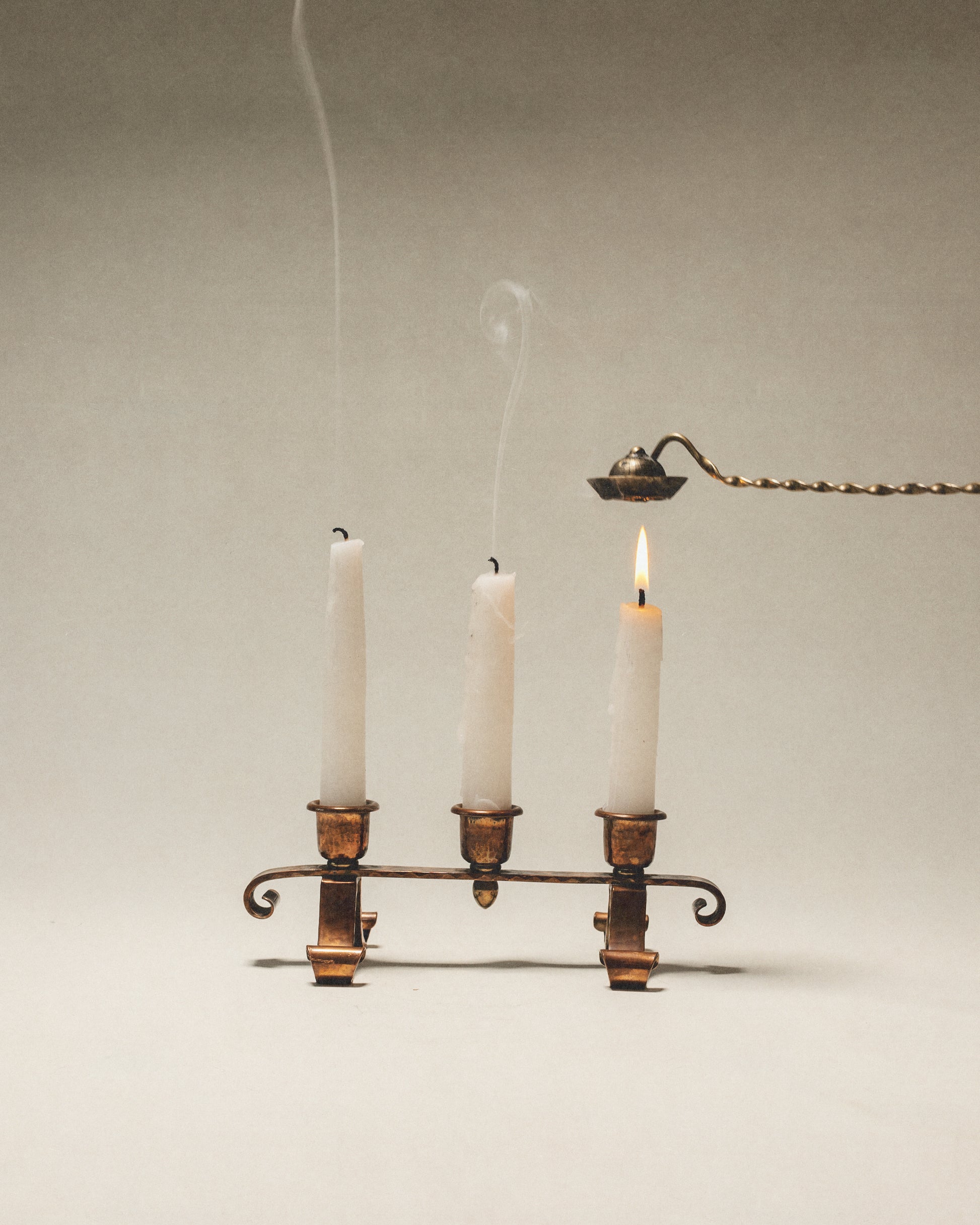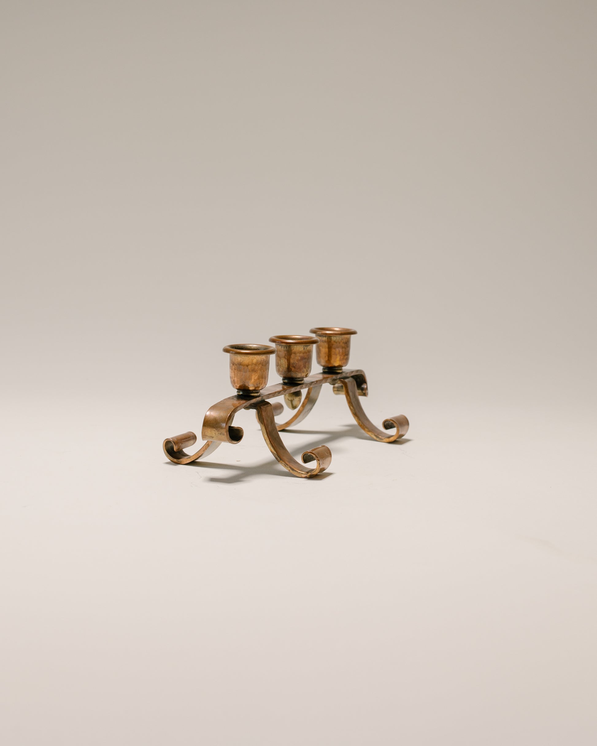 An early 1900’s enchanted candelabra made by Roycroft, a community founded by Elbert Hubbard during the Arts & Crafts movement. Roycroft was committed to craftsmanship, and had the sentiment that it was “ideal to make beautiful things and make them as well as they could be made.” This hammered copper candelabra is truly a special part of the Arts & Crafts legacy. Includes the official Roycroft marking on its underside.